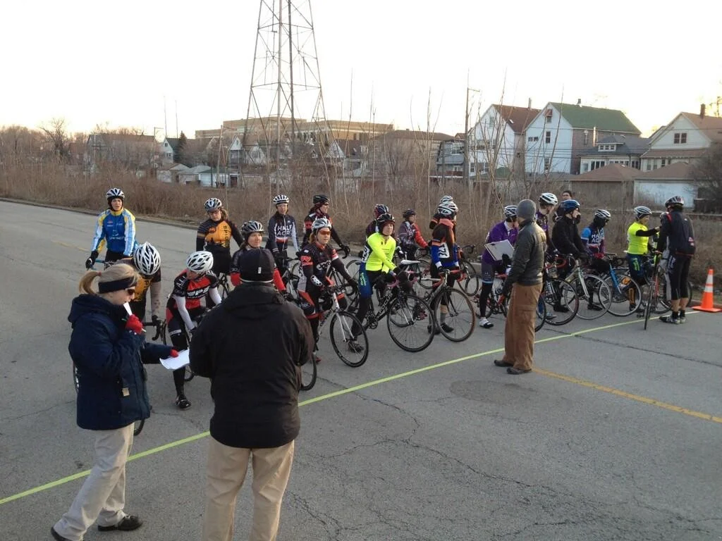 I missed Monday’s races due the commemoration of my people’s exodus from Egypt, and started with the Tuesday night race. Here’s how it went. I retrieved my bike from the office where I had stashed it, and made my way down to Calumet Park (95th St) by about 5:20. I changed into my riding gear, and jumped on my bike to check out the simple rectangular course. Tuesday night it was a counter-clockwise loop, starting and finishing on the west side of the loop (Avenue G). I bundled up (it was in the upper 30s) and pedalled around the course 5-6 times, taking note of the wind, and obstacles including rough road, potholes, cracks, manhole covers that might throw me during the race. Then I stopped to register at the tent and pick up my number. Other Dana arrived and I gave her some extra base layers I had brought (I own more technical fabrics than cashmere, and vice versa for her).Gapers Block Criterium is a 4-day series held at Calumet Park, hosted by Half Acre Cycling. This year marked the 5th anniversary. The races are open to everyone, new and experienced, and are held at the beginning of the season to give newer racers a chance to get their feet wet, in these so-called “practice crits.” What’s a crit? It’s a timed bike race on a closed loop course, usually with a few corners. Gapers Block crits are 30 minutes long, with the number of remaining laps calculated as the race progresses. The winner is the first rider to cross the finish line without having been lapped.